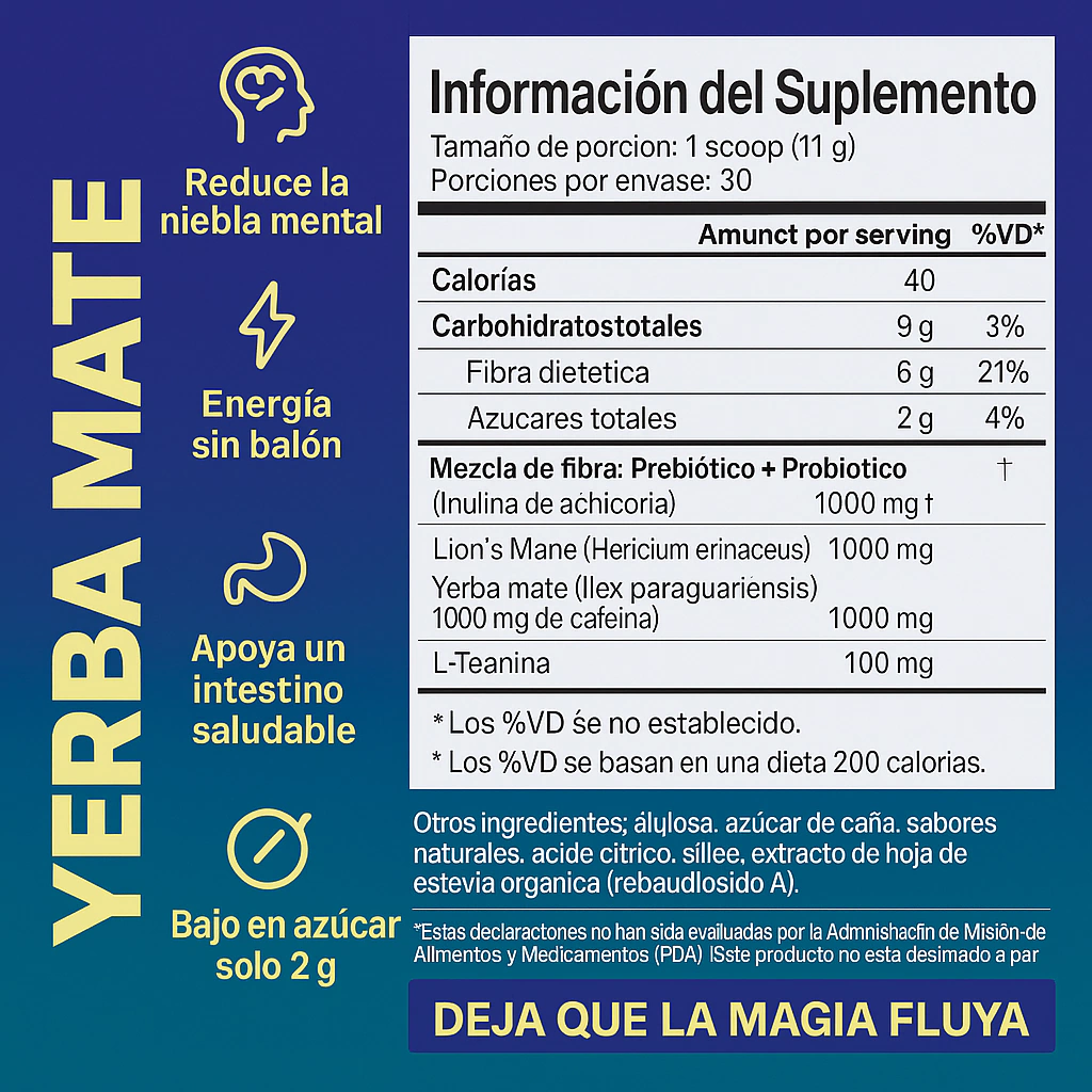 Decile adiós al cansancio y al metabolismo lento. Yerba Mágica te da una energía constante mientras activa la quema de grasa natural de tu cuerpo. Su fórmula combina yerba mate, extractos termogénicos y L-teanina, ayudando a reducir el apetito y mejorar la concentración sin los altibajos del café. Tomala 15 minutos antes de las comidas principales para potenciar sus efectos: acelera el metabolismo, mejora la digestión y evita los picos de hambre. Ya sea que estés trabajando, entrenando o simplemente buscando mantenerte liviana y enfocada, Yerba Mágica te acompaña todo el día con energía limpia, sabor natural y resultados que se notan.